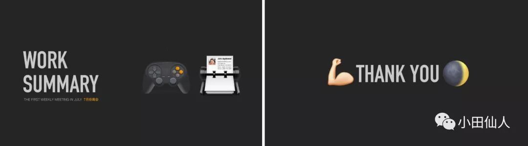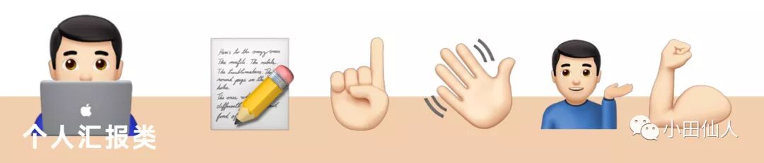 个人汇报ppt的特点是,相对于之前两种的冷静与刻板,增加了更多个人色彩。在使用emoji的时候也自然可以更加大胆一些。个人类的ppt以汇报为主。汇报中我们需要注意的两件事1.把一件很私人的事物(阶段工作/个人经历/学习见闻)讲清楚。这里就可以使用大量的emoji来辅助,增加分段,增加趣味性。通过有趣的emoji串联故事,同时把观众的目光始终吸引在屏幕上,看看你还能带来什么新奇的玩意。2.保持友好与谦虚,不论是个人类的ppt还是汇报类的ppt,看做事是一方面,看做人同样重要,emoji中有大量人型(肢体语言)的icon研究表明,这样的icon可以在潜移默化中强化你的亲和力。使对方感觉你是谦虚友善的。