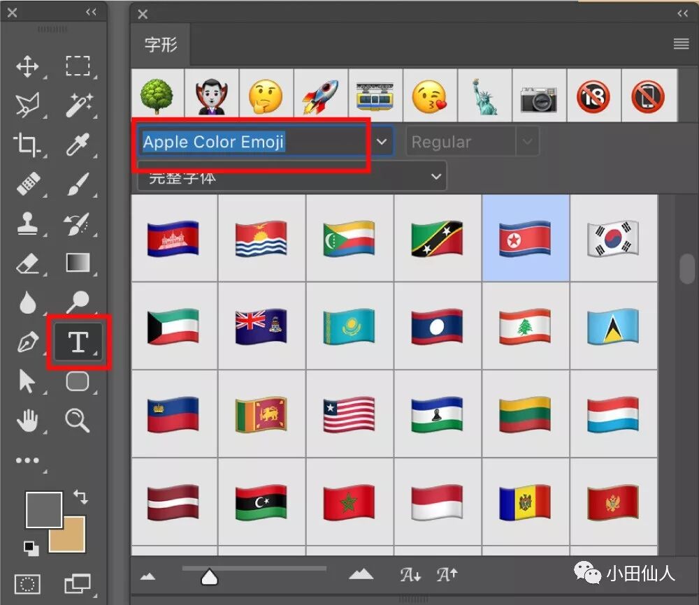 【看上图⬆️】如果抛开索引与搜索功能来看,我们直接使用photoshop来调用emoji也是十分方便的。找到PS的字型功能。然后在字体选择框中(例:mac os 如果是windows系统则是Segoe UI Emoji 我们在上文中有提到过)找到apple color Emoji进入打字模式,双击我们需要的emoji,就可以得到高清的icon了。记得要进入字体模式,emoji在系统中是以字符的形式出现的。不然怎么双击都没用。