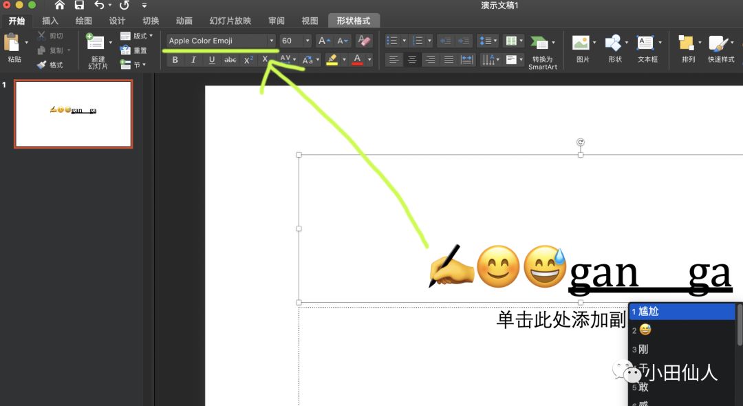 在powerpoint中同理,我们把字体选择为apple color emoji 甚至可以直接用键盘键入颜文字(假如我们知道颜文字的准确中文名)