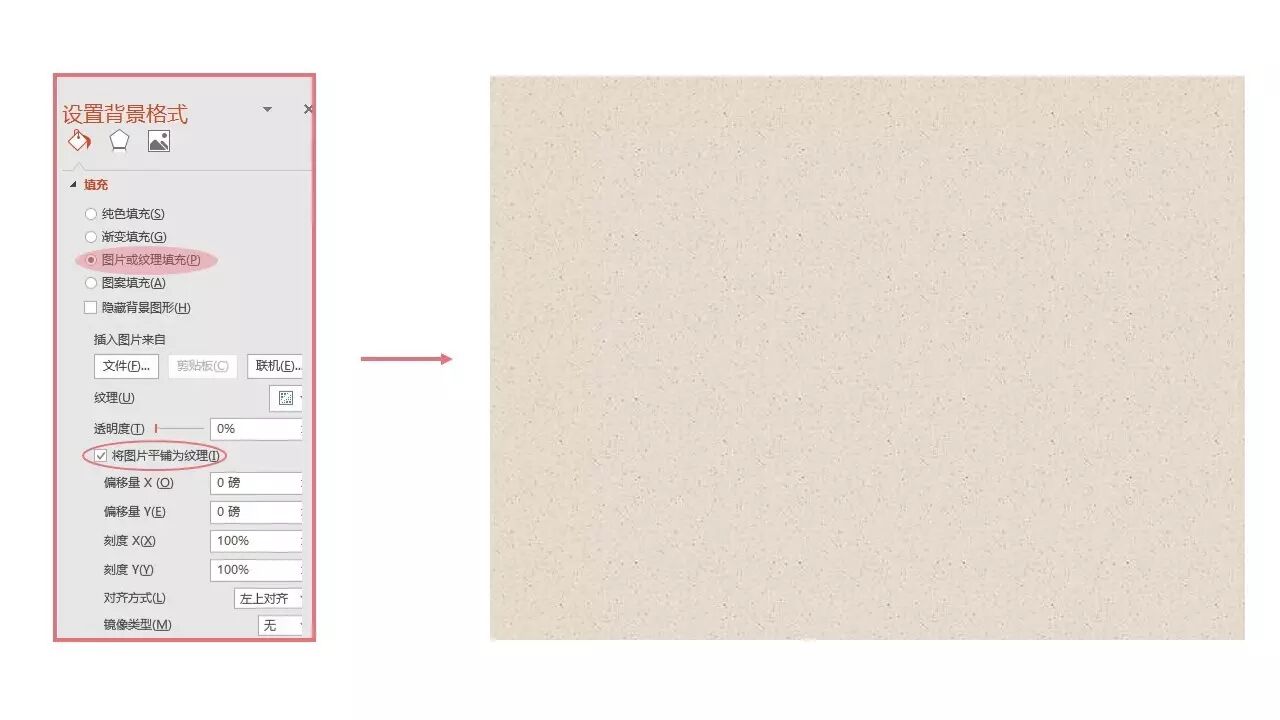 在背景上单击鼠标右键,选择设置背景格式-【图片或纹理填充】,可以选择自带的纹理(也可以插入纹理文件),在这里,注意一定要勾选 将图片平铺为纹理 的选项,之后可以进行一些缩放比例,对齐方式的调节。
