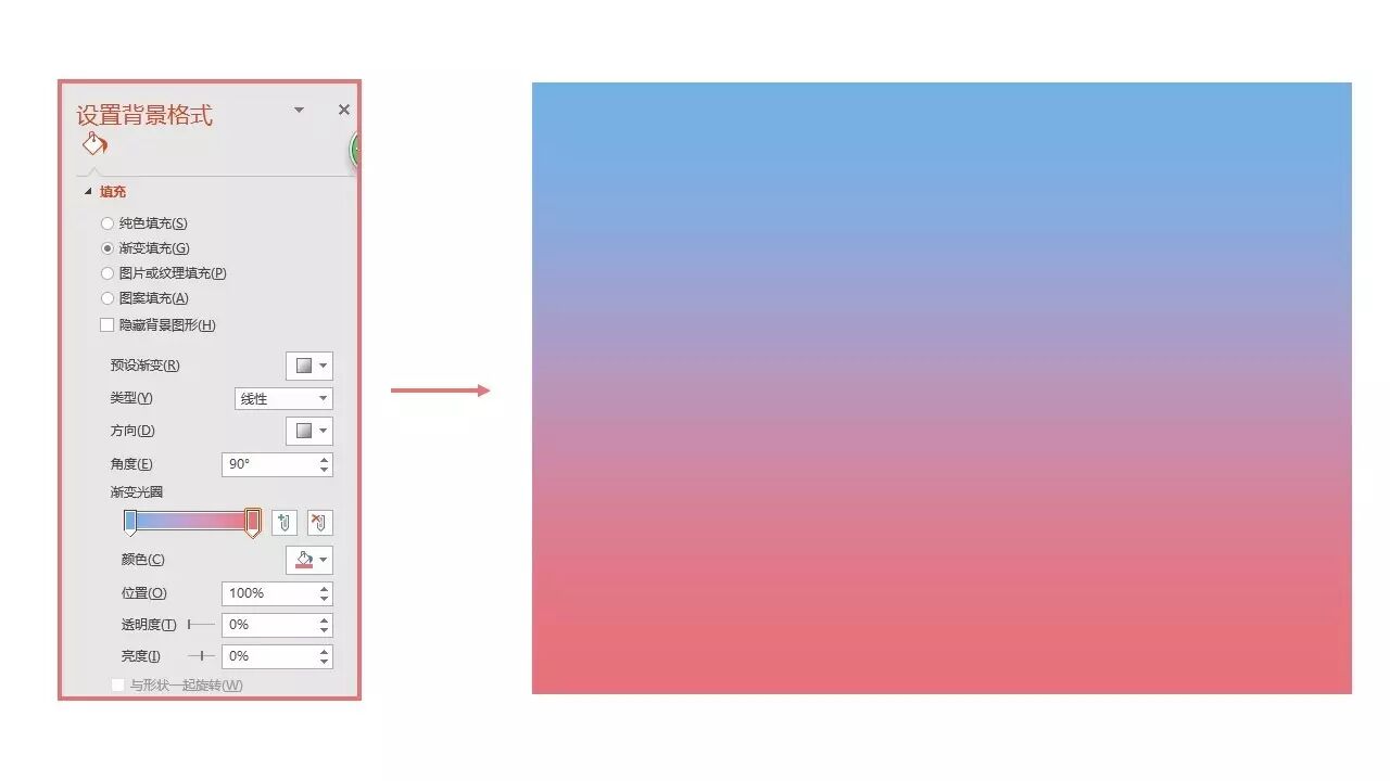 在背景上单击右键选择【设置背景格式】-【渐变填充】(在类型中可以改变渐变的类型,方向,角度)。
