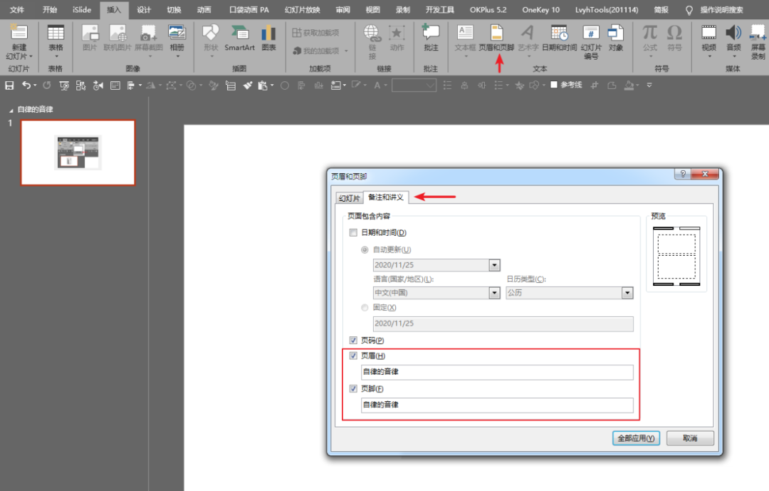 在【插入】中,点击【页眉和页脚】,选择【备注和讲义】,并在页眉页脚栏添加所需的内容。