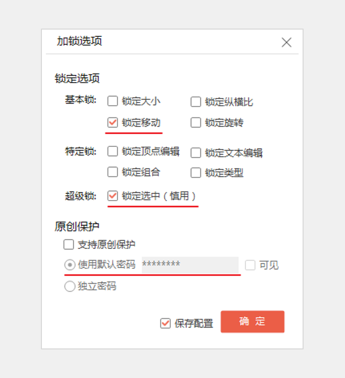 勾选【锁定移动】和【锁定选中】并设置一个密码: