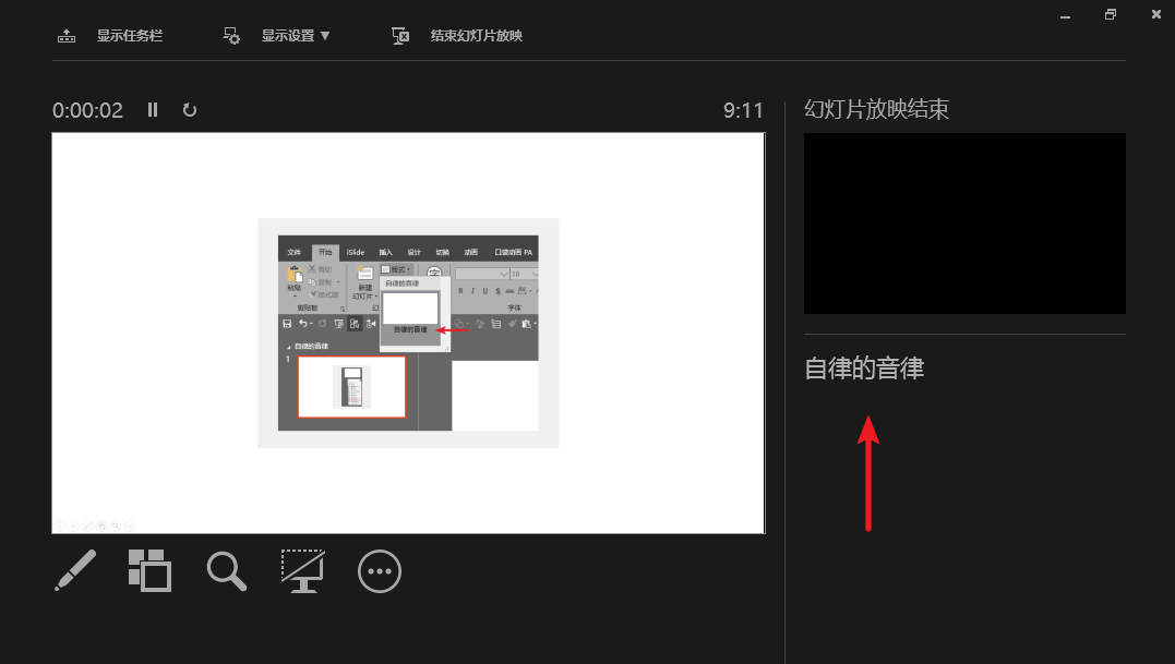 这时候,PPT 左下角的主题名称,就会显示该内容。