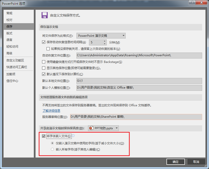 重点来了!我们打开 PPT 的保存选项,勾选字体嵌入: