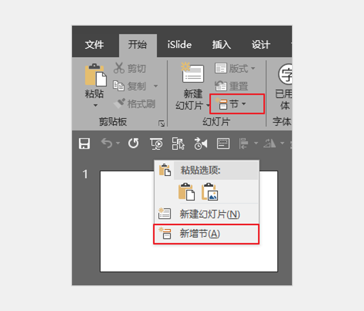 在左侧的缩略图处,右键新增节,或者点击【开始】-【节】
