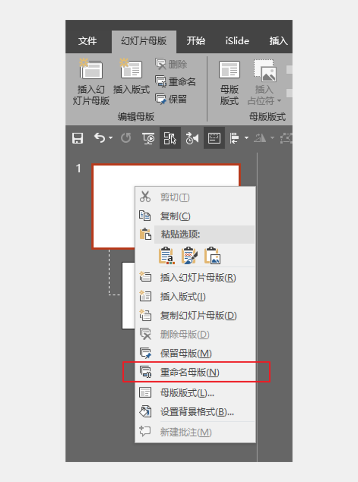 在幻灯片母版视图中,选中母版,右键点击【重命名母版】