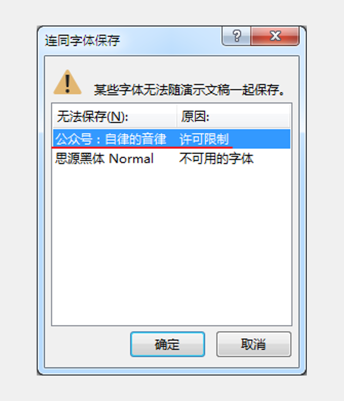 这时候再保存一下,就会弹出字体无法嵌入的提示窗口: