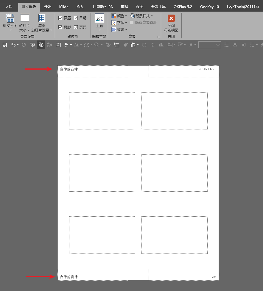 同理,在讲义母版、备注母版,甚至母版中的各种占位符中,也可以添加各种信息:
