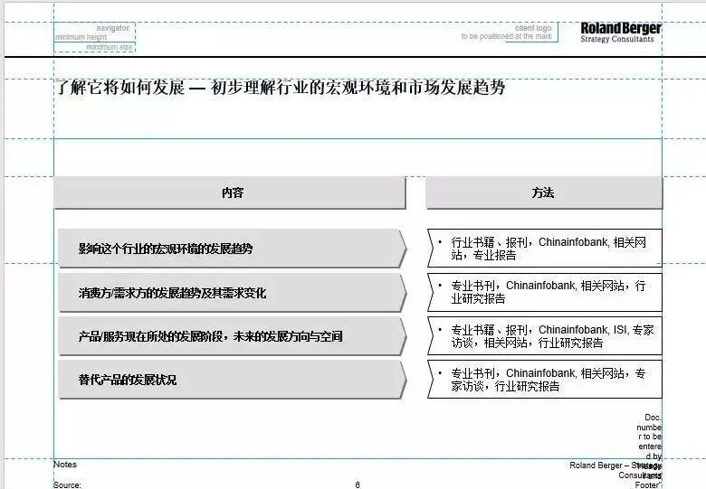 或许你会看到别人画片子清晰又流畅,但自己想要做出一份合格的咨询Deck却总是无从下手,好不容易做出来却还是有很多问题。 有的小伙伴在咨询公司画出的PPT就直接“惊”到了老板,最后直接获得了Earley Decesion Interview。他们是怎么做到的呢? 其实好的咨询PPT不仅仅是页面看上去舒服,从逻辑、页面布局、到各种细节都非常有讲究,今天我们就来一起看看吧! 有三点 必须注意的核心要素 在动手画片子之前,有三点必须注意的基本原则,我们先来看一看吧~ 01 每一张Slide就讲一个观点 在咨询顾问产出的Deck中,每一页Slide看上去都信息量满满,但所有的信息都能清晰突出一个核心观点。这样的排布可以让看的人快速抓准核心观点,同时还很舒服。 正确示范 例如以上这张PPT,内容的重点和非重点可以一眼看出,所有信息都能指向并有力支撑核心观点。这里也告诉大家一个小技巧:每一页PPT的标题应该不仅仅是描述该页内容,而是突出呈现出一个观点。 但如果一张Slide上信息过多且没有明显的逻辑关系,就会感觉杂乱,让人无法快速找到核心观点。比如以下这张PPT,一眼看过去就分为3个板块,但这3个板块之间的关系以及与核心观点的关系就没有被表现出来,重点不够突出。最要害的问题是,这页PPT是内容的一个集合,但缺乏一个核心观点。 错误示范 02 能用图像就不用文字 咨询PPT的布局还有一个基本原则:能利用图形、图表论证的观点,就不要用文字。 许多咨询顾问宁愿绞尽脑汁换一种表达方式,也不愿意堆砌一大堆文字,因为过多的文字会让人产生视觉压力,并且要花时间去思考你想表达什么。 比如想要列举不同区域的区域内商品贸易百分比,当然可以用表格来表现,但这样不够直观且呆板。 错误示范 但如果换成以地图的形式呈现,同时用圆点大小指代百分比的多少就会直观又美观。 正确示范 用“观点” 来为你的页面布局 知道了整体思路,再来看看咨询PPT的整体设计布局,一张典型的咨询公司风格中,可以简单分为这两个部分: 第一,标题。你需要一句话说明这页slide要讲什么。 第二,主体部分。除了可以图表的形式来呈现,还需要注意逻辑与布局,比如利用数字或者箭头说明ABC之间的关系(对比、并列等),向读者暗示了不同层次,非常清晰。 01 标题就是核心观点 咨询顾问做出来的Deck,从标题上就非常有咨询特色。通常是归纳总结每一页幻灯片的核心观点,然后用这个核心观点来替代传统的页标题。 一般PPT的标题都是短语,比如背景介绍、案例分析、结论梳理,而咨询PPT的标题栏则是整页观点的浓缩(即这一页PPT的主旨)。 比如 “2012-2017年间,全球食杂行业超过50%的经济利润化为乌有”,不仅仅在标题点出这属于背景介绍,更是从标题就可以看出这个背景的具体内容。 02 主体需要注意逻辑和布局 麦肯锡高级商业报告指南上写道 :“设计是把思考变成视觉。” 对于咨询公司而言,PPT作为一种商业演示方式,主要任务是传递绝大部分信息。 所以,咨询顾问设计PPT时,思考的不是如何看上去更好看,而是如何把想法和概念用视觉的方式呈现,即表意很重要。 进阶版还可以根据不同的目的选择不同的页面布局形式。比如说,当需要进行优劣分析或者不同品牌的比较时,左右布局就会成为首选。 但是如果我们想要表达的是前后信息并列,并且内容上有一定承接关系,那么左右布局就显得不够明了,这个时候应该采用上下布局来表达。 在细节处 体现Professionalism 知道了基本原则和布局之后,想要做好一张片子,还需要注意这些细节… 01 页面排布要规整 图片文字标题等非常规整,具体到标点符号,大小写,左右对齐,横向分布等各种小细节都十分严谨。在具体操作中会用到标尺、辅助线等进行精细打磨。 比如所有的表格,特别是连续表格图形,每一张的大小,顶点必须是同样的,当你连续多张变动时,需要表格图片位置丝毫不动。同一张slide上,也必须确保图片、表格在同一水平线,同一垂直线。 02 配色协调统一 不同的公司有不同的配色、固用模版,从布局和排版上就能看出是哪个公司的杰作。咨询顾问的PPT都会带有“公司性格”,是一张隐形的名片,也是一种专业性的初步体现。 不同公司的配色通常是跟LOGO相匹配的,比如贝恩以红色为主,麦肯锡以蓝色为主,波士顿咨询则以绿色为主。 当然了,在不给配色示例的情况下,建议不要使用对比强烈、视觉冲击力强的颜色,如红色或黄色。 03 字体、字号要符合规范 运用合适的字号、字体也十分重要。 字号太小,会让读者容易漏掉掉关键信息;字号太大,只能放很少的内容,讲清楚一件事就会变难。 具体操作上可以参考不同的公司对于字号大小的要求,一般正文不小于12号字,标题的字号相应更大。 英文字体常用Arial、Calibri,汉字则可以选择楷体或黑体。 大部分自定义字体确实会比系统的默认字体要更有个性、更优美。但是,千万不要一下子用很多字体,这会破坏页面的整体协调性。 最后让我们再来总结一下PPT制作的三个要点: 基础原则 每页一个核心要点,图像化表达 页面布局 标题即是观点,内容布局合理 细节把握 页面排布规整、颜色统一、字体字号 看完今天这篇文章,相信大家去咨询公司实习遇到PPT相关的工作,应该就不会手忙脚乱了。事实上,在很多金融公司,这些技巧也是同样适用的。所以,不论你的求职目标行业是什么,学会这几个