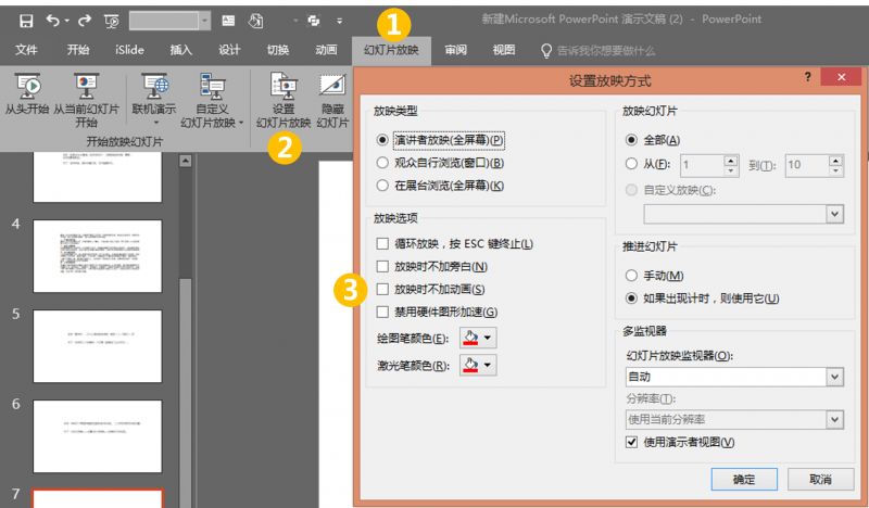 方子:幻灯片放映——设置幻灯片放映——放映时不加动画。