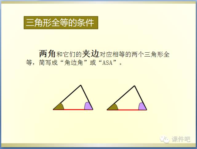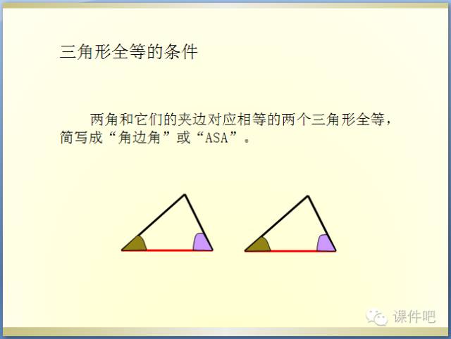 如上图所示,这张幻灯片是关于“三角形全等的条件”课件,文字字体全部采用“宋体”,缺乏对比,没有突出重点。
