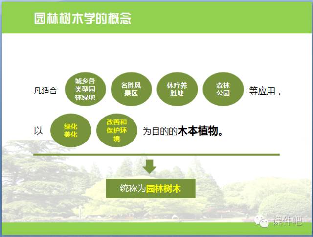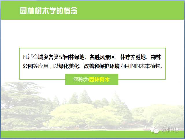 如下图所示,这张幻灯片是关于“园林树木学”的课件,在排版时,除了利用文字的大小、字体、颜色和装饰效果进行内容的对比外,还为文字段落添加了边框(利用自绘图形工具实现),不是文本框的边框)和矩形色块,可以引导学习者的注意力,从而起到强化的作用。而且恰当的边框和文字色块,还具有一定的美化和装饰效果。
