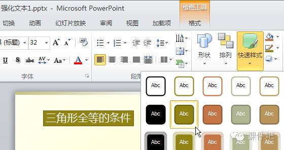 用色块突出重点内容也是ppt课件设计的一个重要技巧。对文字添加“快速样式”是给文字添加色块的重要方法。除此之外,还可以在文字下方添加于文字色彩对比强烈的自绘图形。