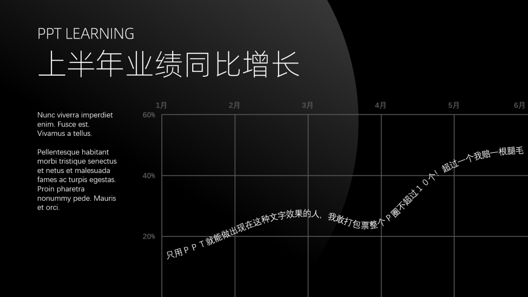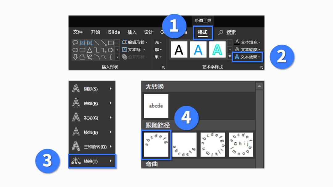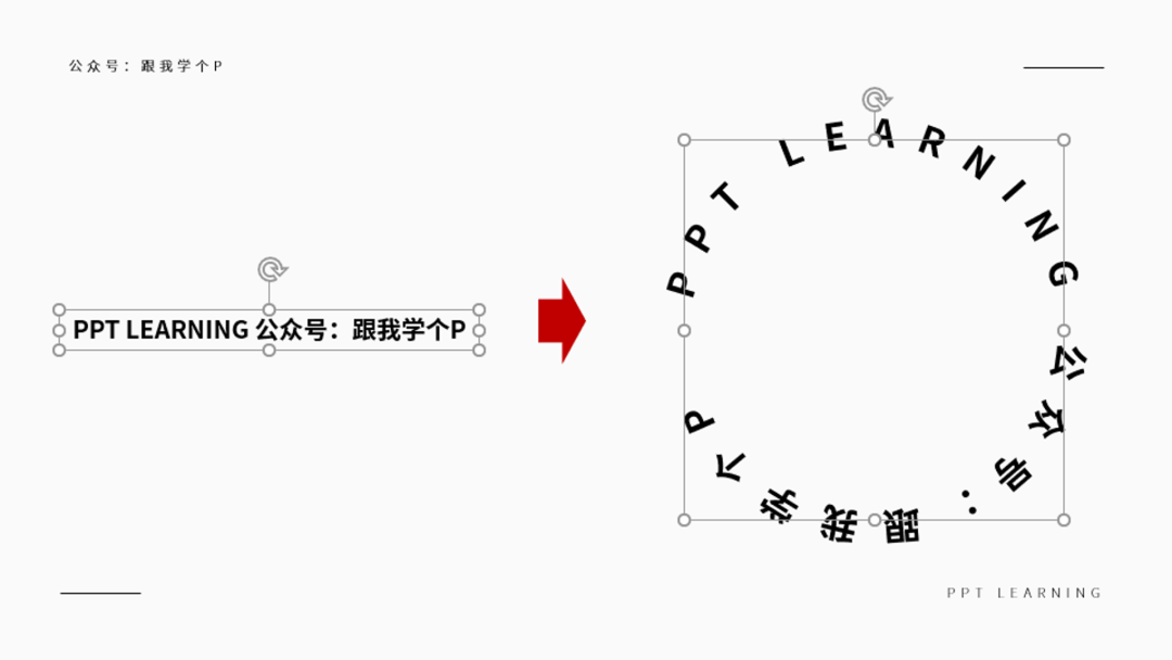 这张图里的弯曲文字字效,用的就是PPT里自带的【文字转换】功能做出来的:
