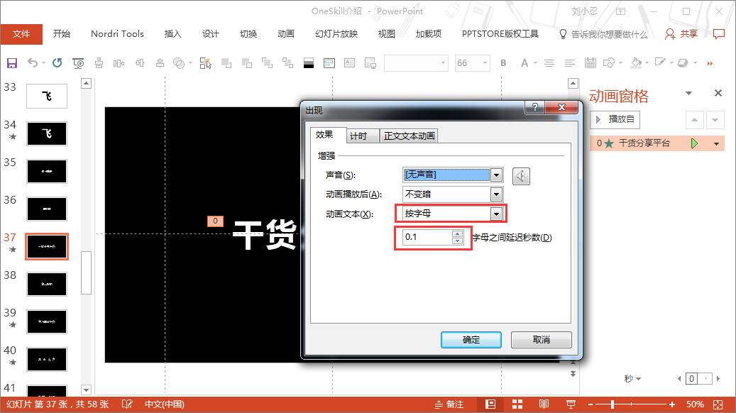 “出现”动画在效果设置时,动画文本按字出现,字母之间延缓0.1秒。