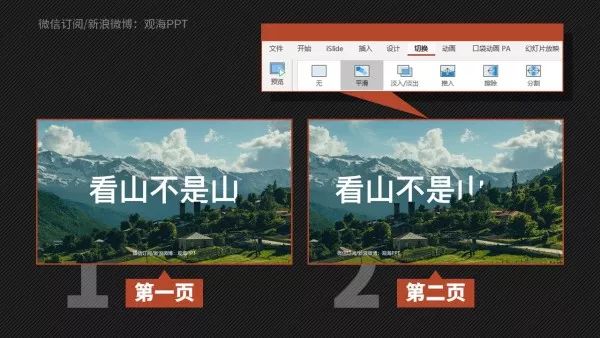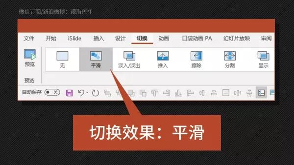 总体思路是借助【平滑】效果进行制作,在PPT【切换】一栏中就能找到。