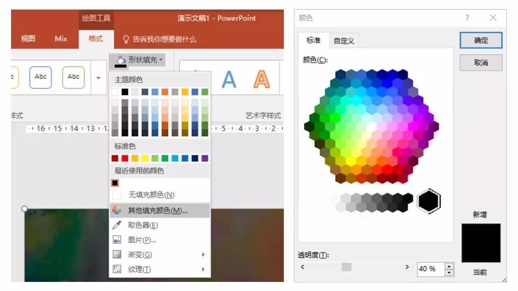 -> 设置矩形形状填充 (其他颜色->选择特定颜色->设置透明度)