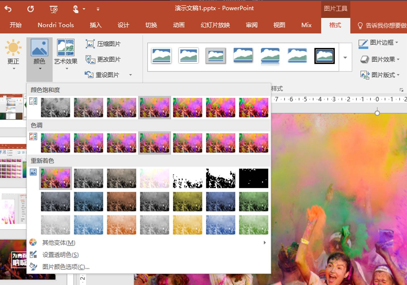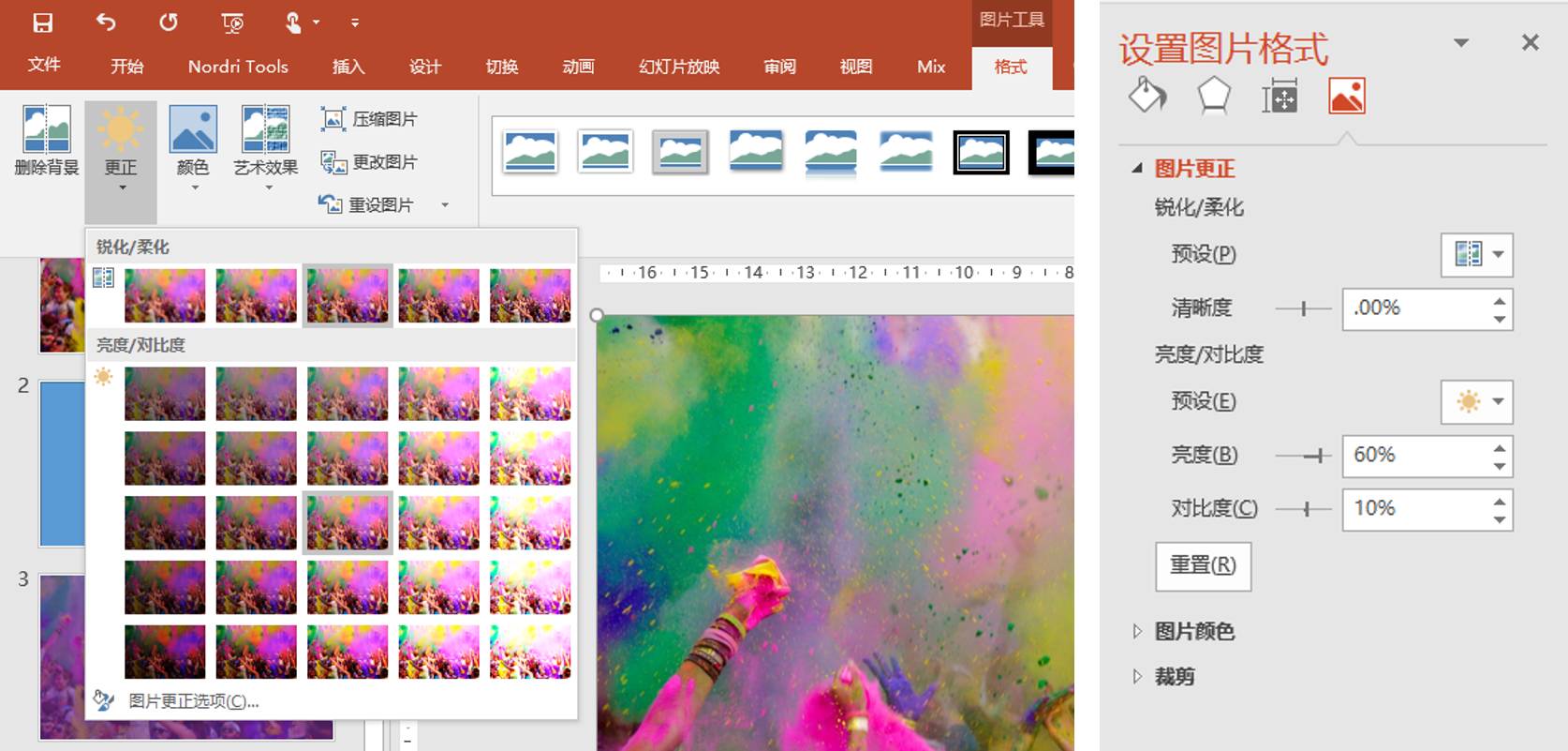 选中图片 -> 图片工具(格式) -> 调整工具 -> 更正