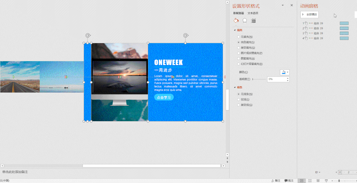 用一个矩形,中间放置一个圆形,选中两个图形,点击菜单栏“格式”—合并形状—组合,即可得到这面有窗户的墙,然后在底部放上不动如山的ONEWEEK,对这面墙添加直线路径动画,移动这面墙就可以产生一种窥视的感觉了。