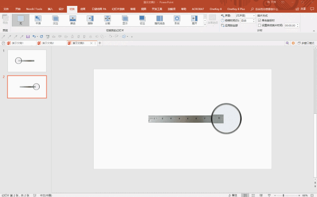 最后一步:选中第二页PPT,来到切换窗口,选择【平滑】,于是乎我们的放大镜效果就做好了。