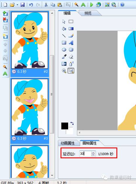 六、粘贴完之后,我们全选所有帧,在帧属性里设置时间“30”,即0.3秒。
