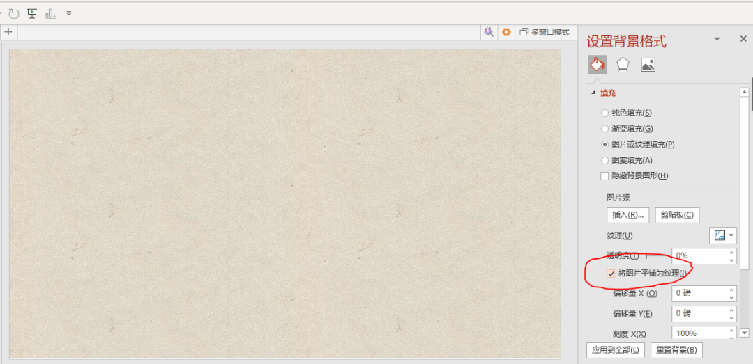 下载好素材后,在PPT中设置背景填充为图片填充,并且要记得勾选将图片平铺为纹理,即可。