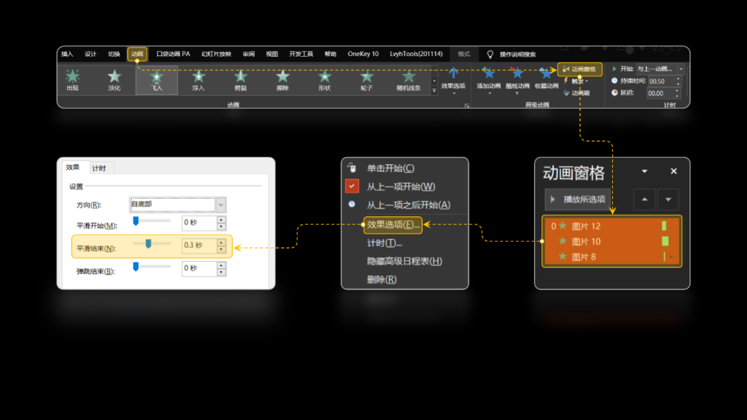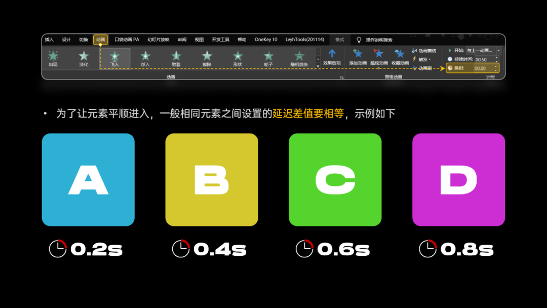 其实,除了添加飞入动画之外,我们还需要进行一些细节上的设置。