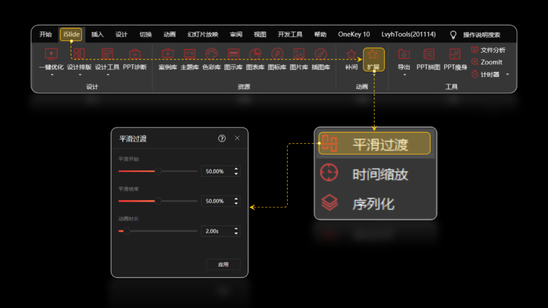 确定选中对应的波形后,我们点击iSlide插件中的平滑过渡,在弹出的窗口中设置时间,并点击应用: