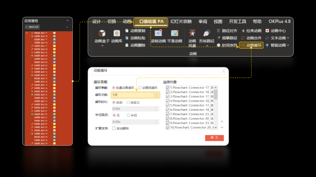 首先在动画窗格中,选中所有平滑过渡所需的动画,然后点击口袋动画插件中的动画循环,在弹出的窗口中,设置循环次数和时间: