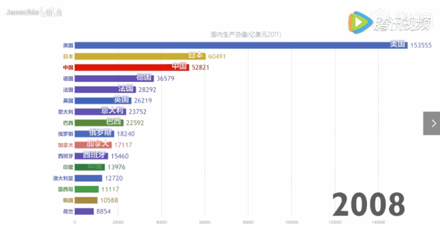 这个动画就是刷爆朋友圈的《世界各国GDP排行变化》▼
