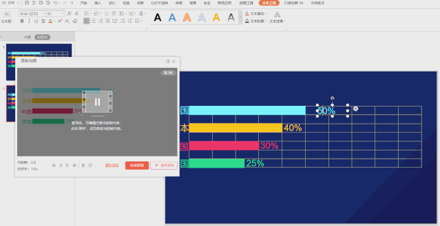 ●动画的录制过程制作,有赖于口袋动画PA插件的支持,该插件同时支持PowerPoint和WPS。所以,录制动画的制作过程,也可以在PowerPoint中完成,体验版的WPS录制在完成后的渲染时,目前版本容易崩溃。
