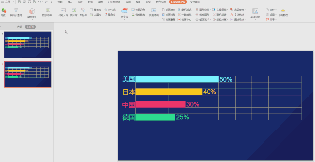 ●动画制作完成后,完整的动画效果需要动态数字WPS体验版的支持才可以;除了数字的滚动效果外,PowerPoint可以播放出其他全部效果,比如条形图的长度变化,上下位置调移动,数字的变化等。