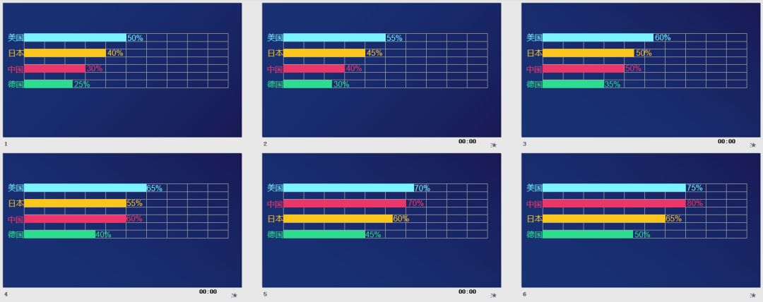 同理,继续复制当前页PPT,重复上面的步骤,进行动画录制(鸟叔做了6页),我们可以得到这样的动画效果▼
