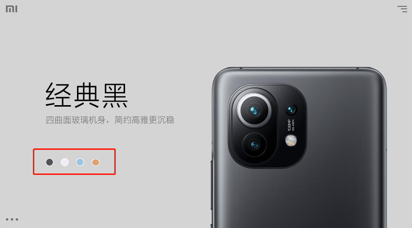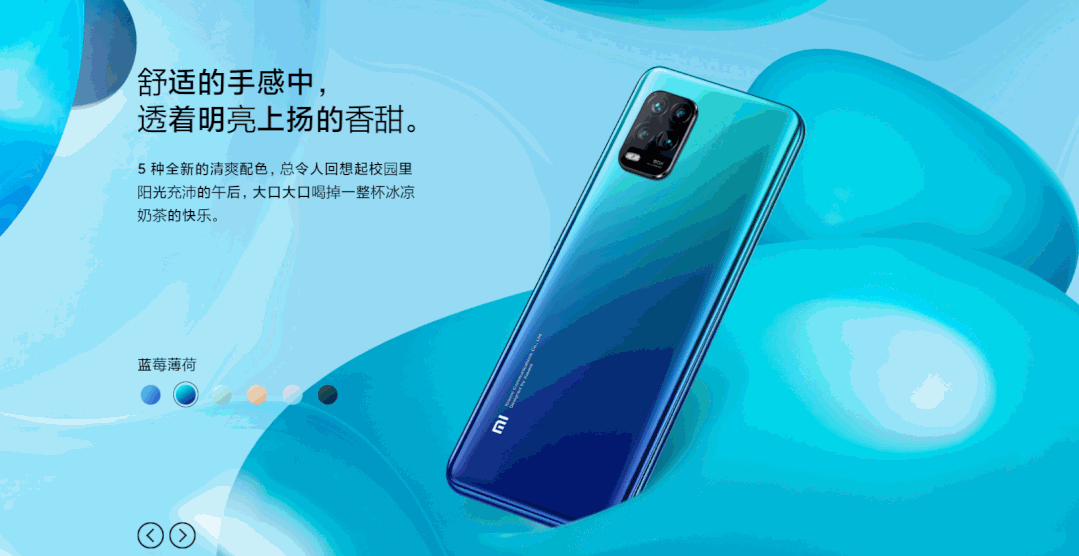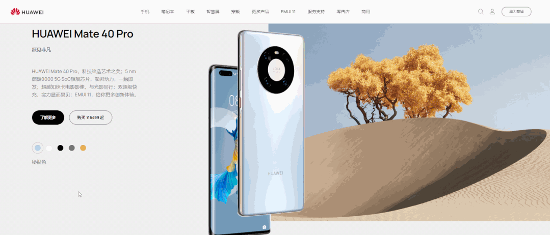 当鼠标点击不同颜色的色块后,界面就会显示出这台手机匹配的颜色以及相关的文案介绍。