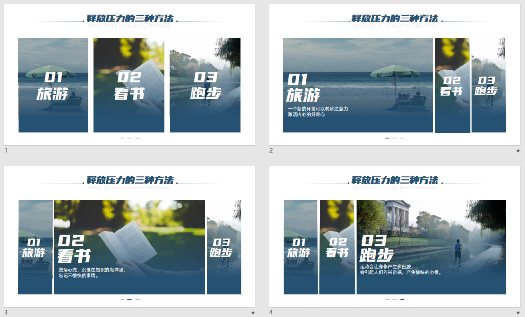 等我们把 4 张PPT内容页制作完之后,就可以使用动作功能来实现交互性效果的跳转。