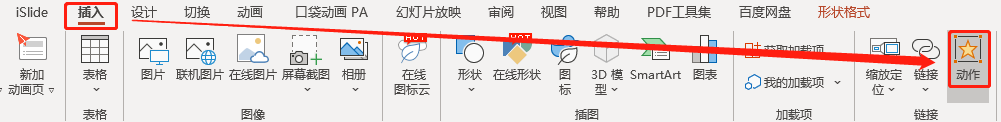 其实很好找,我们只要点击插入,就可以在右侧看到动作功能的设置入口了。