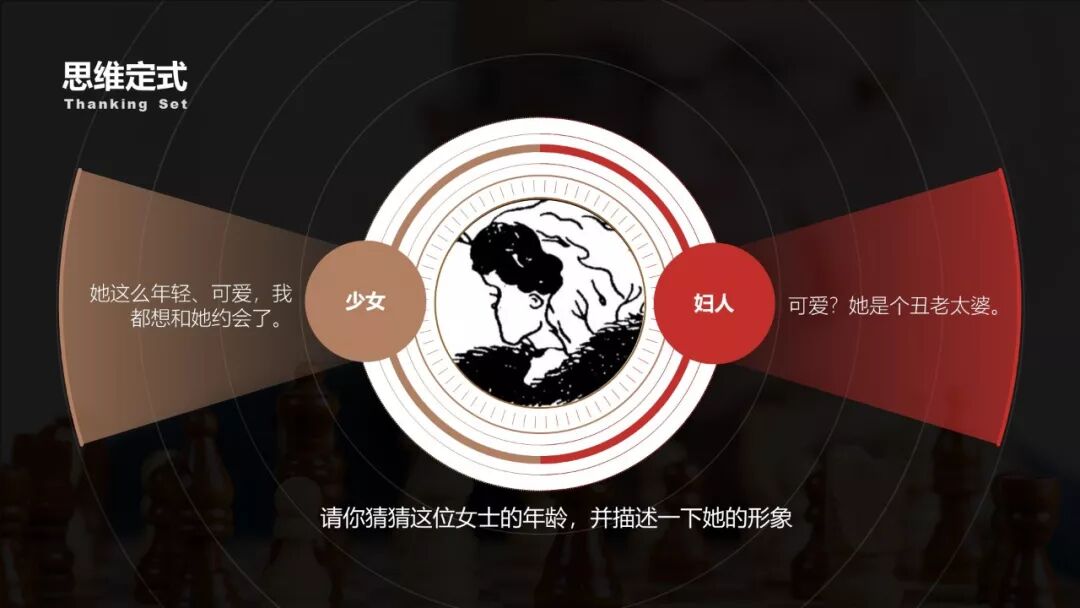 比如下面这一页PPT,为了展示人们在同一幅女人画像中看到的截然相反的两种年龄状态(少女和老妇人),在平面设计上,使用了左右对称的板式,并且以不同的颜色来区分答案。