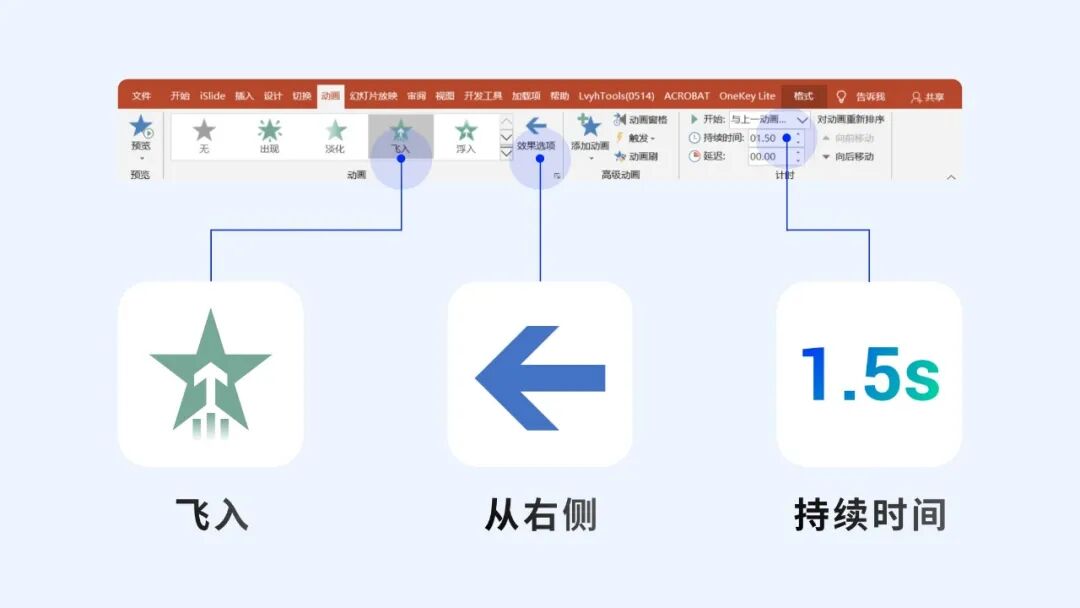 首先给页面的元素添加 [ 飞入 ] 动画效果,方向为 [ 从右侧 ],并将动画持续时间设为 1.5 秒。