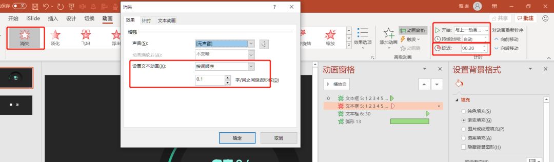 选中左边的文本框,添加一个【出现】的动画效果,点击效果选项,设置文本动画,文本动画选择【按词顺序】,0.1的延迟秒数。