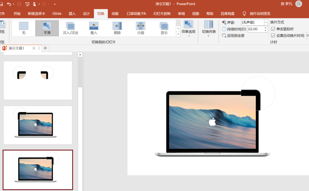 一、图形切换 上面细节放大的效果我们经常能在一些产品的宣传图上看到,其实这也是用到了平滑切换的功能,我们来看一看具体如何操作吧。 (1)图形处理-得到局部放大图 首先我们要对主图进行处理,把要放大的细节部分画上两个圆,然后再复制这张幻灯片。 其次,想要得到局部放大图,我们就要进行合并形状中的相交功能。 (注意:要先选中主图,再选圆形哦。) 同理,用该种方法得到右上角的局部图。 最后,分别对两张局部图进行边框的设置以及适当的放大 这样我们的素材就准备好了。 (2)使用平滑切换功能 将两张局部图分别放在主图合适的位置,如下图: 然后对第二张幻灯片设置平滑的切换效果。 这样就得到想要的效果啦。 (1)准备素材 先准备好两张幻灯片,页面中需要相同的文字。其中文字和排列根据自己想要的效果去设计,小编先展示基础的变换。 (2)平滑切换 对第二张幻灯片添加【平滑切换】的切换效果,然后在【效果选项】中选择【文字】。 然后最后的效果就是这样。 (1)准备素材 输入数字然后对其进行排列,如下图: (2)平滑切换 对第四、五张幻灯片添加【平滑切换】的切换效果,然后在【效果选项】中选择【字母】。 有兴趣再设计一下光效,一个有动感的动画就出来了!