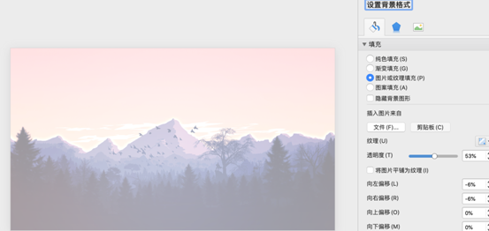 导入一张森林背景的图片,操作流程:右击PPT页面——选择背景格式——图片或纹理填充,然后再根据页面的情况调一下图片的透明度,如下图所示: