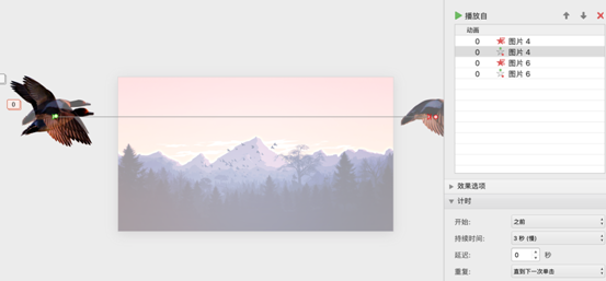 到此,交替闪烁+动作路径的动画就已经完成了,是不是觉得很简单呀。除了小鸟扇动翅膀飞翔动画,还可以举一反三进行以下扩展。