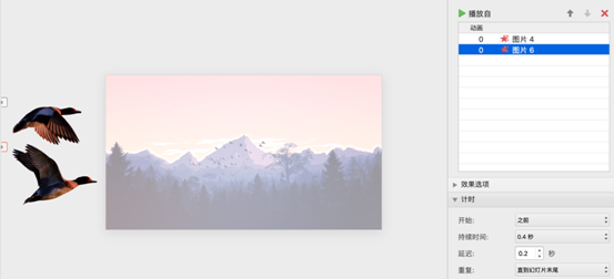 然后再给第二只小鸟添加动画效果,具体操作流程和第一只小鸟的操作一样,只是在计时选项参数设置有点不同,延迟是0.2秒,而不是0秒。这是非常关键的设置,只有不同的延迟才能达到相互交替闪烁的效果,给人的感觉就是小鸟的翅膀一上一下地扇动,如下图所示: