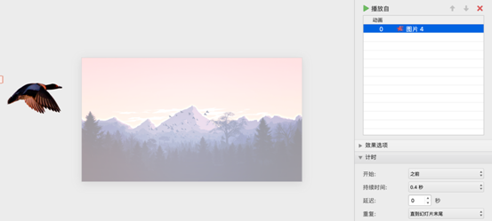 来制作路径的动画了。两只小鸟的路径动画都是一样的,操作流程:动画——路径动画——直线,然后在计时选项设置参数:开始——之前,持续时间——3秒(慢),延迟——0秒,重复——直到下一次单击,如下图所示: