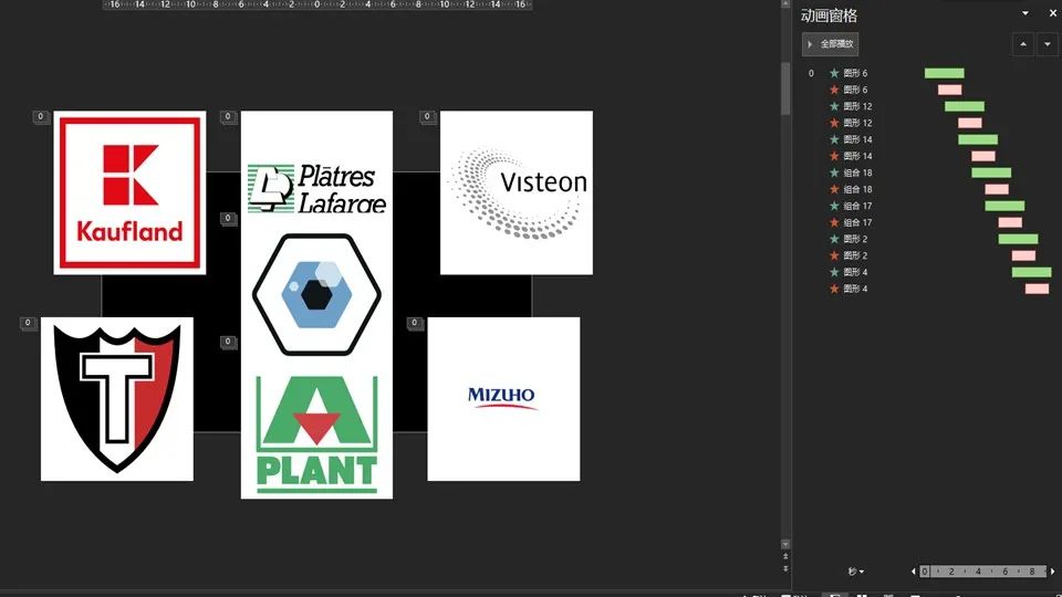 根据上面的这种逻辑,对所有Logo的动画参数进行设置后,就会出现上述图中动画窗格的阶梯型形状了。