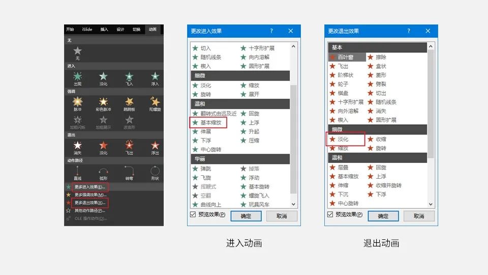 在PowerPoint中,上述第一阶段的动画可由“基本缩放”实现,它的位置在“更多进入效果”——>“温和”中。