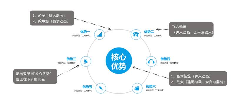 第三组:六个图标,动画效果同“核心优势”(可用动画刷),由上往下有时间差