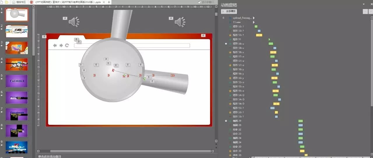 ①、时间轴的调整:为了便于调节动画操作,建议大家把动画窗格从默认位置移动到合适的位置,可以放在上方,也可以放在画面中,最好把画面的时间轴放大(在左下角可放大时间轴)