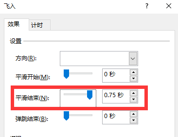 添加“飞入”动画,并调整方向,时间设置为0.75S,设置好【平滑结束】